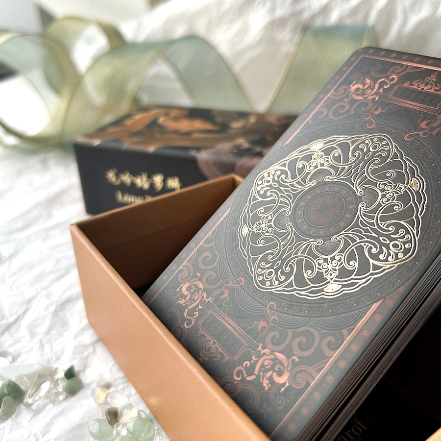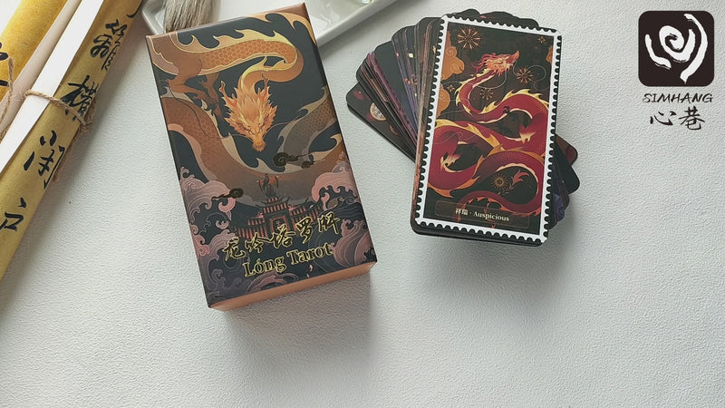 The Dragon's Roar Tarot Deck includes a hard top-and-bottom card box, 79 tarot cards, and a fully Chinese-interpretation manual.Both the text on the card box and the dragon pattern on it adopt the gold stamping process, and the text on the front also incorporates the embossed UV process.